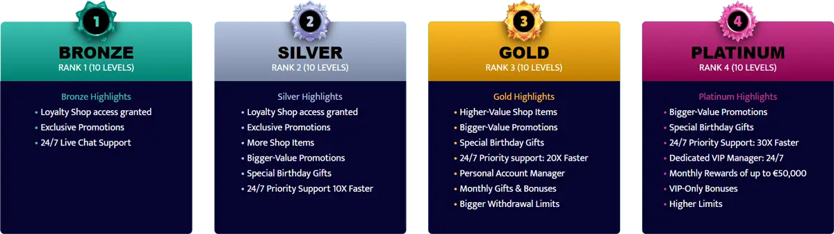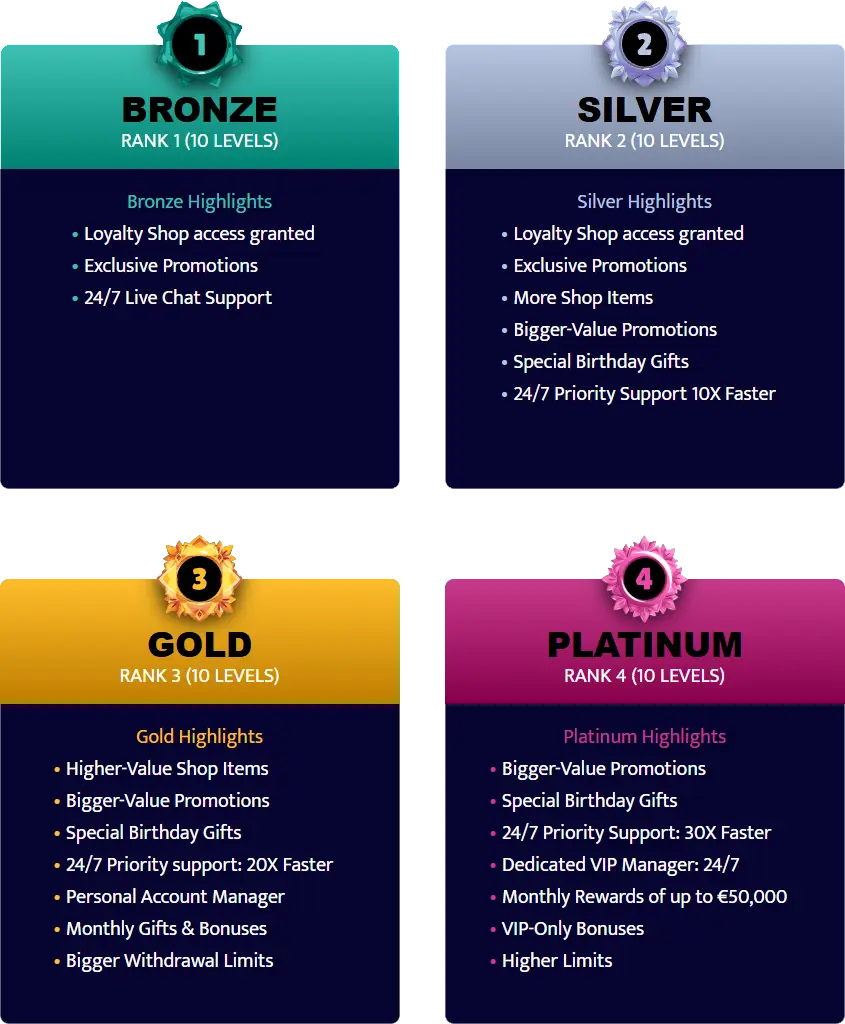 När spelare satsar riktiga pengar tjänas mynt och XP. XP höjer lojalitetsnivån och låser upp bättre belöningar, medan mynt kan användas i lojalitetsbutiken för bonusar, free spins och utvalda förmåner. VIP-spelare får personlig hantering, högre cashback, bättre kampanjer och snabbare uttag efter individuell bedömning.